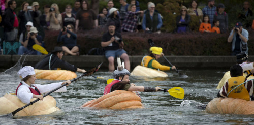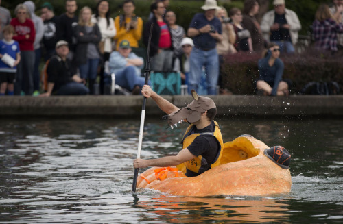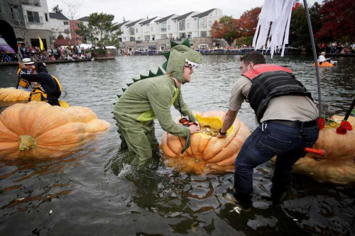 重达数百公斤的巨无霸南瓜,就在挖空里面的肉与籽后,马上变身成为一种奇特的小船,开始当天的划船角逐竞赛。