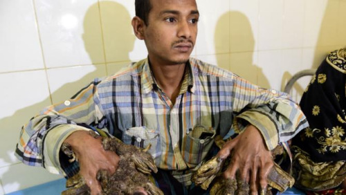 “一开始,我以为这些疣子是无害的。”他在达卡医科大学医院接受记者采访时说:“但是我逐渐丧失了劳动能力。我双手上长出了几十根两三英寸长的‘根’。我腿上也长着这种小‘树根’。”他不得不辞去了自行车搬运工的工作。这次手术至少能帮助他摆脱5公斤的负担。