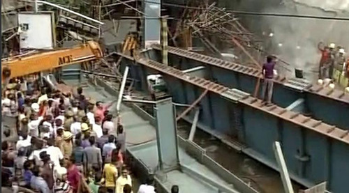中新网3月31日电 据印度媒体报道,印度加尔各答北部Girish公园附近一座在建过街天桥发生倒塌事故,至少有100人被埋在废墟之下,有媒体报道称这次事故已经造成10人死亡。
