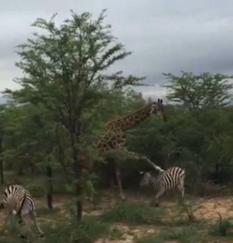 【环球网综合报道】据英国《每日邮报》3月31日报道,日前,几名游客在南非观光时拍到一头长颈鹿狠狠地踢了抢了它“就餐”位置的斑马一脚,引得在场游客哄笑。