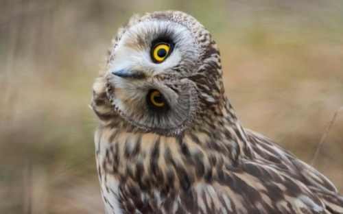 这只野生猫头鹰看到人类侵入它的地盘时,疑惑地扭过头来,最后连整个头部都180度倒转了。