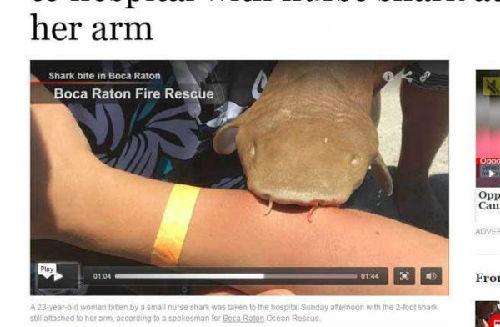 台湾《中时电子报》网站5月16日报道,一名23岁的女游客周末前往佛罗里达州波卡雷顿海滩游泳,不料却遭到一头小鲨鱼攻击,小鲨鱼紧咬着女游客的手臂,怎么样都甩不开,就算离开水里上岸了,依旧不肯松口,救护人员也束手无策,只好将这一人一鲨一起送往医院。