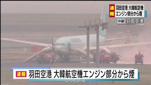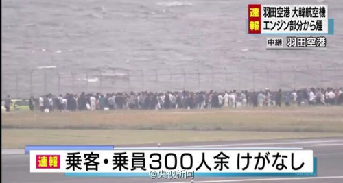 参与互动 据日本NHK电视台报道,今天中午,东京羽田机场一架大韩航空公司客机起飞前左侧机翼突然起火,冒出白烟。目前机上乘客及机组人员共300多人已用应急滑梯疏散至地面,暂无人员受伤报告。该航班原计划从东京飞往首尔。(央视记者吴琼)