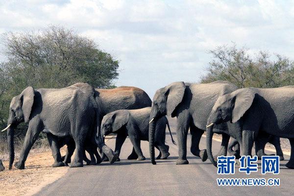 图为克鲁格公园里的大象群在过马路。 新华网记者高原摄