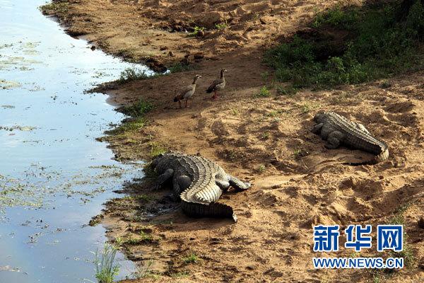 图为克鲁格公园里的2条鳄鱼在伺机捕捉2只野鸭。 新华网记者高原摄