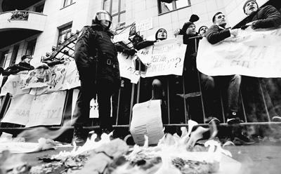 2015年11月25日,示威民众在莫斯科的土耳其驻俄罗斯大使馆外游行,抗议土耳其击落俄罗斯空军一架执行对叙利亚境内极端组织实施军事打击的战机。