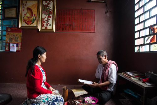 三保公庙自然更是柬埔寨华人慎终追远之所在。殿堂墙上,一侧挂着用工整楷书记下捐建三保公庙华人的名录,一侧是中国元素“梅”与“鱼”画,寓意“坚强、高洁”和“年年有余”。供桌上,一本泛着岁月痕迹的繁体中文解签书静静等待来人的翻阅。不时有信众走进来,对着神像顶礼膜拜,随后晃动签筒,摇出一根签来求解,再虔诚地轻手向解签人递上一叠香火钱。
