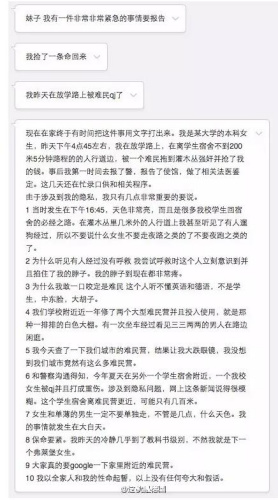 在此之前,名为“这就是德国”的微博号发布了一条据称是性侵受害者本人的自述。其中写道,她是某大学的本科女生,16日下午4点45分左右,走在放学路上时,在离学生宿舍不到200米、5分钟路程的人行道边被人拖入灌木丛,遭到性侵和抢劫。