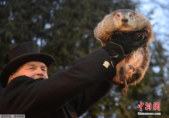 当地时间2016年2月2日,美国宾州旁苏托尼,当地庆祝一年一度的土拨鼠日。如果土拨鼠看到自己的影子,就表明春天即将来到。今年土拨鼠“菲尔”预测寒冷的冬季还要持续六周。