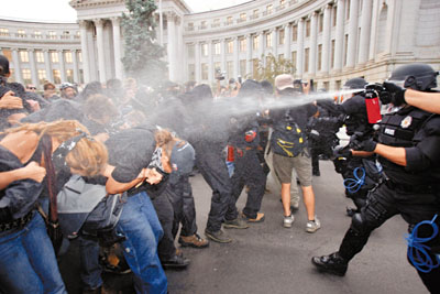 昨晚,会场1.6公里外的丹佛市及县大楼外爆发警民冲突,防暴警察向300名阻碍交通的示威者施放胡椒喷雾,试图驱散群众,是大会展开以来警方首次暴力对待示威者。部分示威者向警察投掷盛满颜色液体的胶袋,至少两人被警方拉走,暂时未知是否有人被捕。