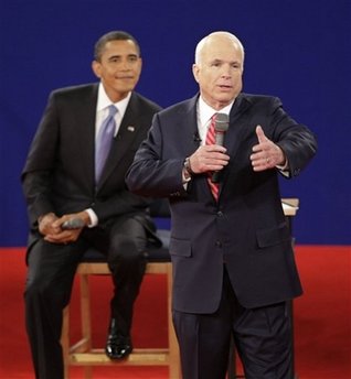 麦凯恩在和奥巴马交锋时多次微笑,而当他想强调某些议题时,还降低音量近似耳语。他在奥巴马讲话时有时似乎不知该站在哪里,曾经一只手撑在椅子上,身体斜靠着。