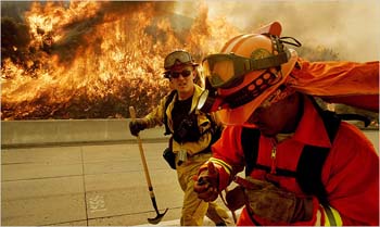 现时,加州面临的最大的危险之一是,灰烬到处飘散,随时都可以燃起新一场大火。消防人员彻夜搏斗,试图控制火势。在有些地方,消防员拿著水龙头挨家挨户地灭火。