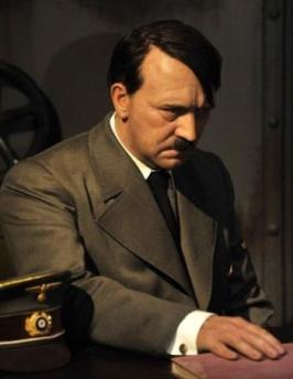 这尊蜡像塑造的是苏联红军兵临城下后希特勒在自杀前的最后时刻。与其他蜡像不同的是,表情垂丧的希特勒坐在一张桌子后面(见图)。蜡像馆的人这样安排,其用意是防止有人与希特勒蜡像合影,或者毁坏蜡像。