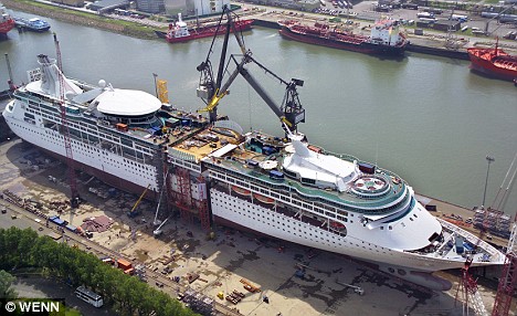 中新网8月26日电 综合报道,把游轮“一刀两断”,然后再塞进去一节船舱,继而拼装成一艘“扩大版”的客轮,这样的“大刀阔斧”可不是幻觉,这艘长916英尺游轮的主人确实将船锯开,要将其再扩展73英尺。