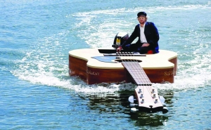 据报道,乔什的这艘“吉他船”名叫“马顿号”,马顿公司是澳大利亚的吉他制造厂商,而这艘“吉他船”正是由该公司设计定做的,它上面装有舷外马达,可以在水中自由地航行。
