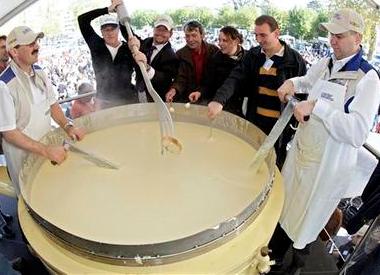 中新网10月27日电 综合报道,日前在瑞士西部古城莫尔日,众多志愿者和厨师聚集在一起,试图制作出世界最大的干酪,创下世界纪录。