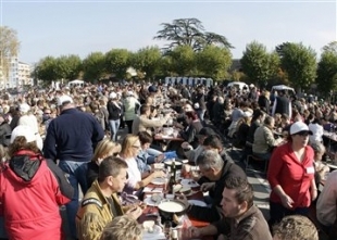 他们把980千克奶酪和420升白酒混合在一起搅拌,然后将成品分成950锅,分发给5000名食客。这些观众把意大利的经典白面包倒在这融化的奶酪里,津津有味地品尝,场面极其壮观。