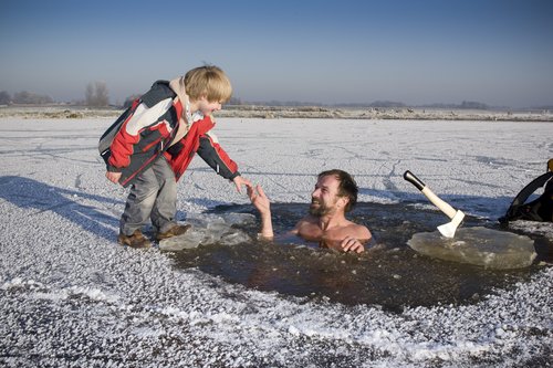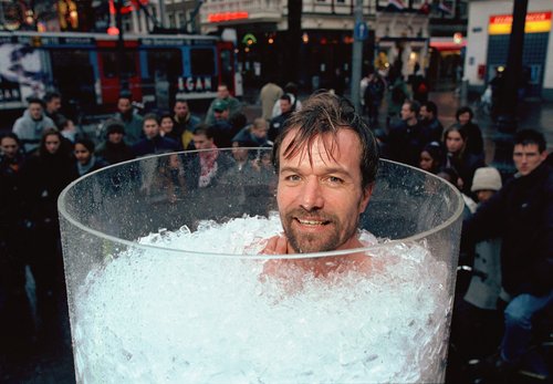霍夫说:“我当时和某人在公园散步,看到了冰。我突然冒出个想法:要是站到冰中会怎样呢?我非常想试一下。于是,我脱掉衣服,在里面站立了30秒。出来后,我有一股强烈的愉悦感。从那以后,我每天都这样做。”