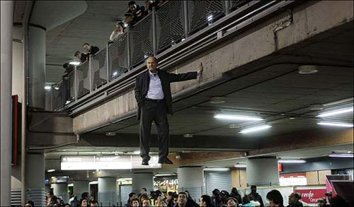 据英国《太阳报》2月11日报道,在西班牙马德里阿托查火车站,一名德国艺术家约亨宁•洛尔贝尔站在车顶似乎站在“空中”的乘车方式雷倒众人。(环球时报记者王斯)