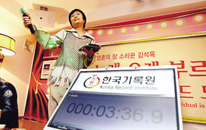 据法国媒体21日报道,日前韩国家庭主妇金锡玉连续K歌76小时,打破了先前美国人马库斯保持的连续K歌75小时的吉尼斯世界纪录。更让人钦佩的是,这位韩国麦霸大妈还不是第一次打破吉尼斯世界纪录,早在两年前她就破了当时的个人K歌最长时间的吉尼斯世界纪录。