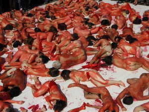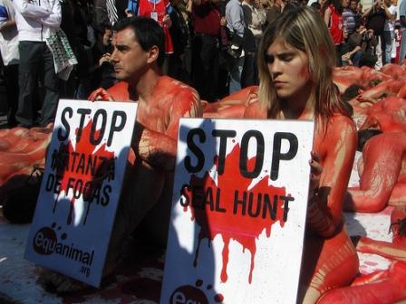 示威者在身上涂上红色颜料,装扮成被猎杀的海豹,抗议捕杀海豹。
