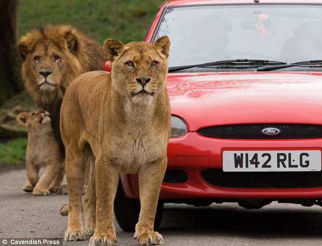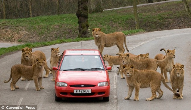 据英国《每日邮报》报道,这辆被10多头狮子围困住的福特车,车门和窗户都紧紧地关着,以防动物袭击。但是,被困在车内司机的表情就看不清了。