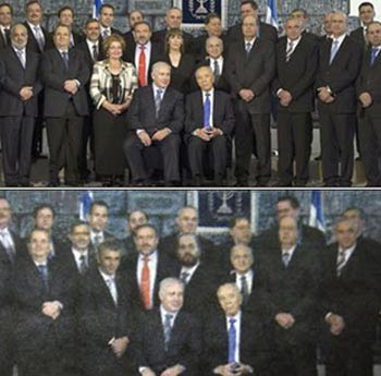 据克罗地亚“网络”4月6日报道,两家犹太极端主义报纸Yated Neeman周报和Shaa Tova报将新内阁集体合影照中的两名女性官员——以色列新任文化和体育部长利莫尔·利夫纳特女士和移民署署长Sofa Landver女士——经过数码技术处理,使她们在合影上“奇怪”地消失了,而站在她们位置上的变成了两名男士。
