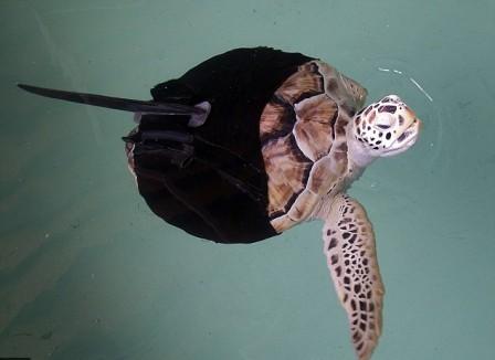 中新网4月10日电 据英国《每日邮报》报道,曾遭鲨鱼袭击失去一只鳍的绿海龟,因难以平衡,只能在水里打圈圈。日前,科学家为它装上了一个人造“义鳍”,穿上类似马甲的“义鳍”,这只5岁的小龟终于可以和它的同伴们一起自由自在的游泳了。
