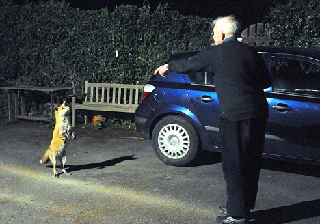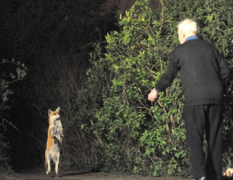 中新网4月17日电 一直以来,狐狸被认为是一种警惕性很高的动物,很少主动接近人类。然而,你能想象野生狐狸像人一样直立,并跑到你家的花园里乞讨食物吗?据英国《每日邮报》17日报道,英国德比郡的一群野生狐狸在一位老人的训练下,学会了如何用后腿站立,它们还定时到这位老人家中乞讨食物。