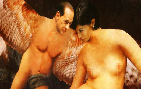 在潘塞卡的这幅作品中,贝卢斯科尼化身赤裸着身体的天使,用巨大的翅膀亲昵地搂着意大利机会平等事务部长玛拉·卡尔法尼亚,含情脉脉地盯着自己的女部下。