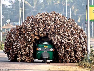 报道称,这辆超负荷的三轮车在小路上缓慢行驶,甚至还没有走路快,引来众多旁人侧目。车上的椰子堆成山高,掩没了车夫,路人在一旁高呼“不可思议”。