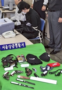 据目击者透露,作案时郑某从头到脚都是黑色装扮。他带着黑色帽子和黑色口罩,身着黑色上衣和裤子,甚至还带着黑色泳镜和头灯,以便在烟气中睁开眼睛。另外,他腰间插着一把瓦斯气枪,一个脚腕别着一把刀,胸前还带着两个手枪模样的打火机。