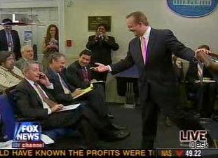 三家主要的有线电视台都实况转播了白宫新闻发布会。《人事》杂志记者约翰-吉兹的手机首先传出铃声。吉布斯在听到铃声后称:“请放至震动,我们以前也是这样作的。”当手机再次发出声音后,吉布斯走下讲台,要求吉兹交出手机,他随后把手机扔给站在房间后面的一位助手。就在吉布斯回到讲台,开始回答一个问题时,美国哥伦比亚广播公司记者比尔-普朗特的手机又响了起来。已负责报道白宫事务25年的普朗特拒绝了吉布斯交出手机的要求,他离开了房间,人们发出一阵笑声,普朗特五分钟后回到他的前排座位。