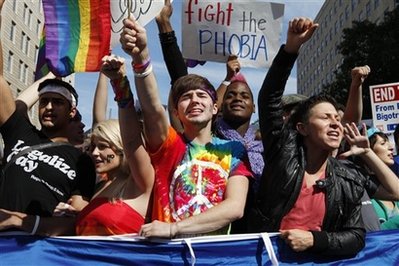 中新网10月12日电 数千名反对歧视同性恋的活动人士11日在美国首都华盛顿游行,呼吁给与同性恋者平等的民事权利。