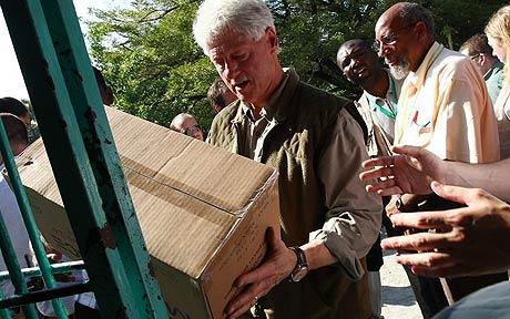 抵达海地的美国前总统克林顿正在帮助医疗救援物资卸货。