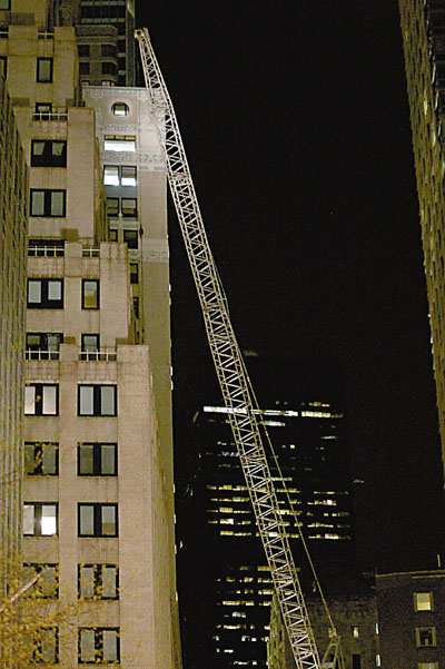 前晚约7时半,一部无人操作的巨型起重机吊臂突然松脱,击中仕女巷80号的25层高大厦。当局封锁水街至百老汇的一段仕女巷,以及弗莱彻街至华尔街的一段珍珠街,又疏散4栋大厦,包括一栋住宅。