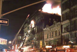 大火发生在第285大街上一栋六层商住两用楼。目击者称,楼顶的大火接近10米高,浓烟滚滚。