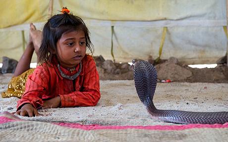 就像人们在电影中看到的一样,男孩子会吹着传统的长笛吸引毒蛇舞蹈,而女孩子则在家负责照料这些有毒的眼镜蛇。