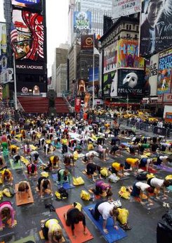 中新网6月23日电 据美国媒体报道,200多名瑜伽爱好者日前聚集在纽约时代广场,用集体瑜伽的方式迎接夏至的到来。