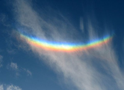 专家解释,一般彩虹的出现,是光线穿透雨点后折射到另一处时所产生的现象。但这朵天空中的“微笑”是日光穿透卷云或层云中的数百万颗细微冰晶粒子时形成。
