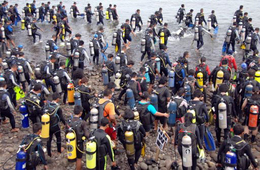 此次活动是为了庆祝印尼独立64周年。当众人潜水至水下后,还特别展开了一面印尼国旗。