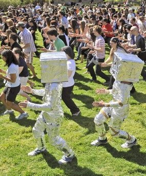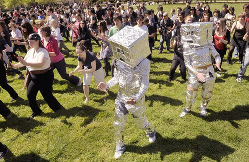 318名来自澳大利亚墨尔本大学的学生在草坪上齐刷刷地跳起了机械舞,其中还有一些学生从头到脚裹上了金属箔纸,还有一些身穿海盗服装。一名摄影系学生拍摄下了集体舞的场面并制成了纪录片。