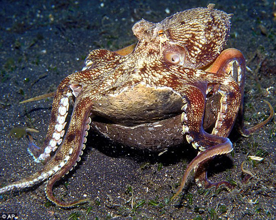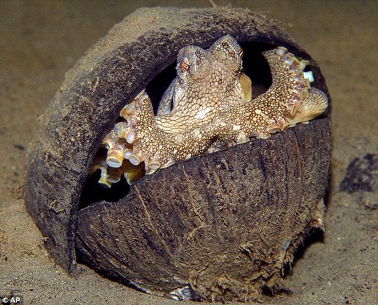 中新网12月16日电 据香港《文汇报》16日报道,研究发现,八爪鱼比人类想象中聪明。澳洲墨尔本维多利亚博物馆生物学家费芬及诺曼,于1998至2008年间,在印度尼西亚海域拍摄到逾20只拳头大小的纹理章鱼,懂得收集椰子壳做盔甲。它们从海底拾起人类丢弃的半球形椰壳,清空后在海床拖行20米,当生命受威胁时,便上下各一个躲藏到壳内。