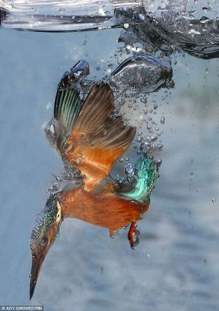 翠鸟的俯冲速度每小时达40公里,能捕捉到水下60厘米处的鱼,通常只能看到一个蓝点一闪,它们就钻进了水里。由于翠鸟的眼睛能迅速调整水中光线所造成的视角反差,因此翠鸟捕鱼几乎是百发百中。