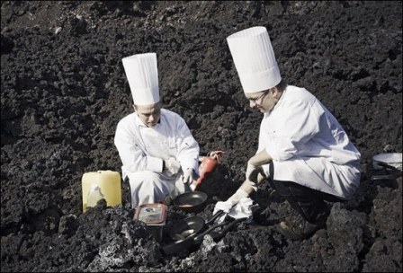 中新网4月1日电 据外电31日报道,冰岛的一些美食家日前在该国持续喷发的火山脚下为顾客提供了一次绝妙的就餐经历,他们用火山岩浆烹制了一顿特别的大餐。