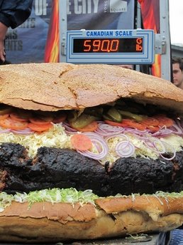 李德尔等烤巨型汉堡,用的是特制的烤架,里面还有叉架,便于翻动大汉堡。他说,烤这个汉堡共花了6小时。先是将重139公斤的肉饼放上烤架烤熟。之后再将之装进48公斤重的面包内,再加生菜,乳酪,蕃茄,红洋葱,腌黄瓜及烤肉酱等。