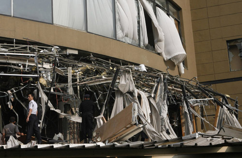 一位在丽思-卡尔顿酒店附近工作的目击者看见酒店的一些窗户被炸得粉碎,大部分都是低层的窗户。酒店外墙受到严重损毁,窗户玻璃炸至粉碎,大量碎片散落在人行道上,万豪酒店则有烟冒出。据中国驻当地使馆人员表示,南航驻当地办公室距离万豪酒店不过500米,玻璃被震碎。