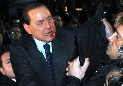 中新网12月14日电 当地时间13日,意大利总理贝卢斯科尼在米兰市中心的米兰大教堂附近参加一场政治集会,发表完演讲离开时遭到一名中年的男子的袭击。该男子隔着保镖向他的右脸方向扔去一件重物,导致其鼻骨轻微骨折,两颗牙齿断裂,嘴唇内外也都受伤,需要在医院接受24小时观察,以及为期20天的治疗。消息一出,举世哗然。