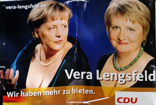 据新加坡《联合早报》报道,德国基督教民主联盟成员伦斯费尔德将在下个月27日的选举中,竞选柏林一个左翼选区的议席。她的竞选团队最近张贴的竞选海报,展示了她本人和默克尔并列在一起的照片。两人都穿上低胸晚装,露出了性感乳沟,上头还打上“我们还有更多可以奉献”的标语。