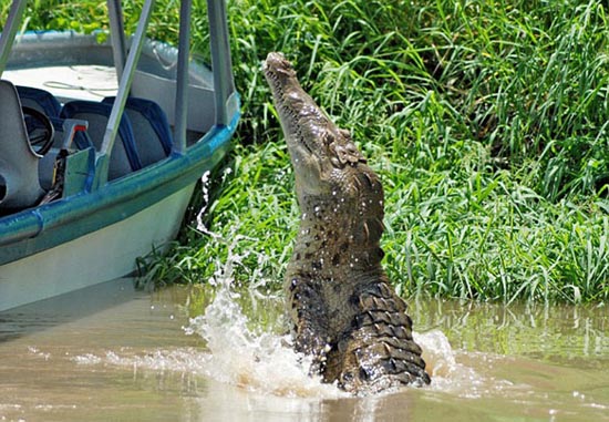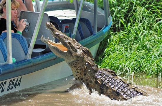根据保罗的描述,当看到河上那只懒洋洋的鳄鱼后,船上的导游就用木棍敲打水面,希望能吸引鳄鱼更靠近一些。“鳄鱼果然随着木棍游来,越来越近,当大家都还没转过神时,那只原本温顺的鳄鱼突然跃出水面,张着血盆大口朝那位女游客扑过去。”这时船上的所有游客都尖叫起来,大家都拼命向后退。
